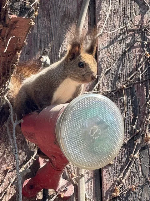 合同慰霊碑の掃除をしようと納骨堂に向かって歩いていると牛舎の方から物音がしたので振り返るとエゾリスが軒を渡っていました。リスはよく見かけますが、駐車場を横切っていたり木に登っていたり、基本的には遠くから見ることが多いですが、